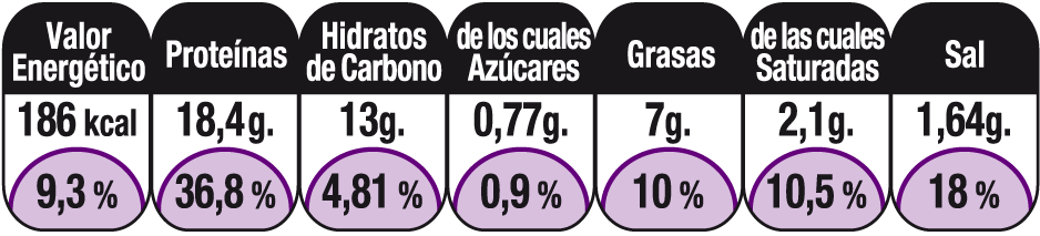 Envase: Bandeja con atmósfera protectora Peso por bandeja: 250 g. Caducidad: 20 días Sin gluten, sin lactosa y sin sulfitos.